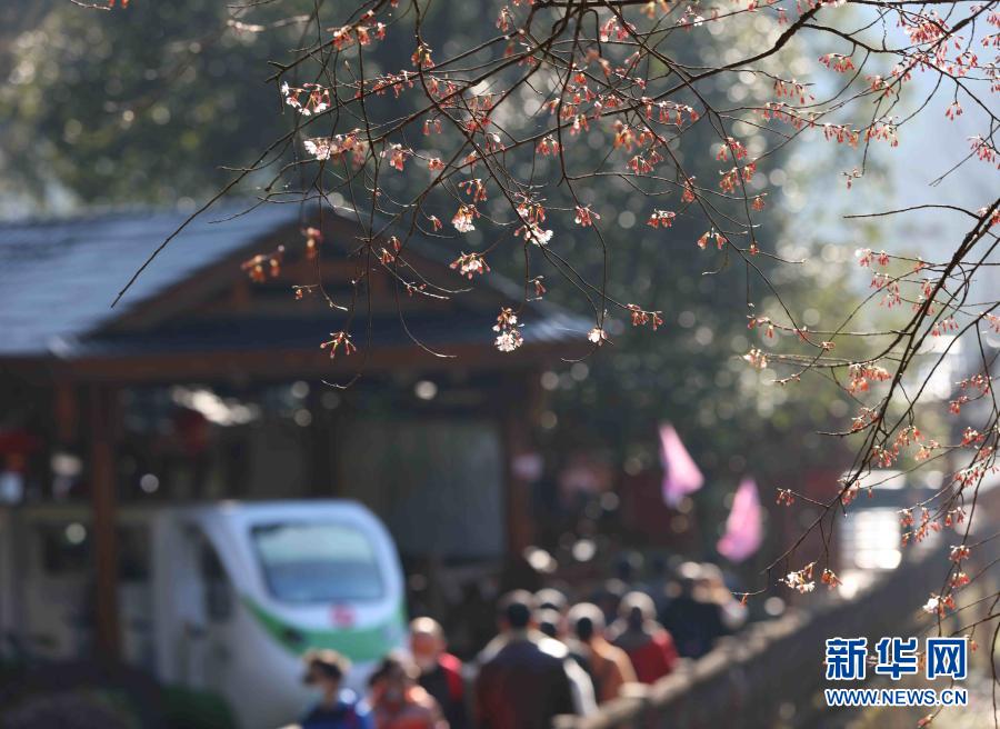 2月14日,游客在湖南張家界武陵源景區(qū)十里畫(huà)廊觀賞櫻花。新華社發(fā)(吳勇兵 攝)