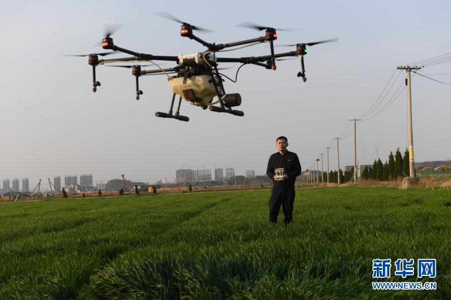 2月23日,湖州錢(qián)山下糧油專(zhuān)業(yè)合作社工作人員操縱無(wú)人機(jī)給小麥噴施農(nóng)藥。立春過(guò)后氣溫回升,浙江省湖州市吳興區(qū)道場(chǎng)鄉(xiāng)全力開(kāi)展春耕工作。今年該鄉(xiāng)計(jì)劃播種農(nóng)作物總面積1.2萬(wàn)畝,其中水稻5000畝、小麥2000畝。新華社記者 翁忻旸 攝