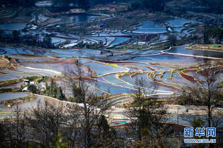 春日里,位于云南省紅河哈尼族彝族自治州元陽縣境內(nèi)的哈尼梯田在不同光照條件下呈現(xiàn)出豐富色彩,與周邊村寨、山系等和諧相融,猶如一幅幅色彩斑斕的油畫,美不勝收。