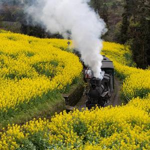 3月2日,一列嘉陽小火車經(jīng)過菜子壩附近的花海。