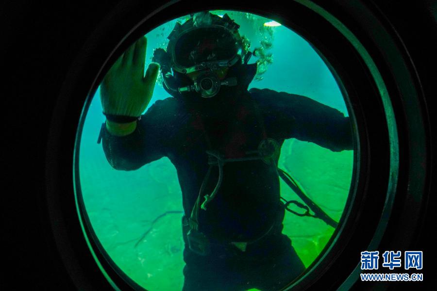 3月15日,在長(zhǎng)江水下40多米的白鶴梁題刻無(wú)壓容器罩內(nèi),潛水員在對(duì)參觀(guān)廊道的觀(guān)察窗玻璃進(jìn)行清理。新華社記者 劉潺 攝