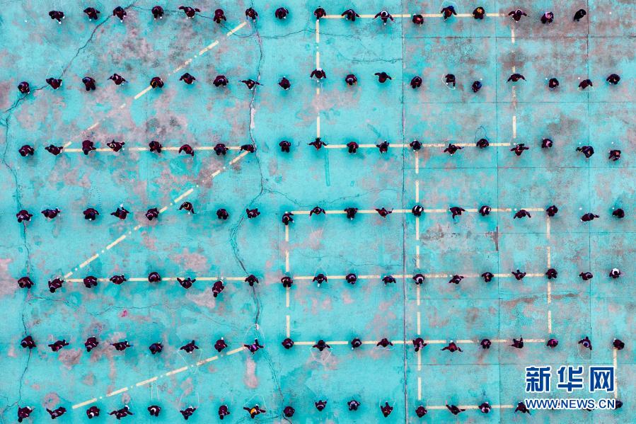 騎路小學(xué)學(xué)生們在大課間進(jìn)行跳繩鍛煉(3月9日攝,無人機(jī)照片)。新華社記者 李博 攝