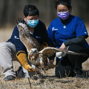 當(dāng)日,北京猛禽救助中心在北京市延慶區(qū)野鴨湖濕地公園附近空地放飛了兩只康復(fù)治療后的大鵟。此次放飛的兩只大鵟在去年12月分別被市民發(fā)現(xiàn),其中一只因饑餓、虛弱原因被救治,另一只因闖入市民鴿舍覓食被發(fā)現(xiàn)且身體有創(chuàng)傷被救治。經(jīng)過(guò)三個(gè)月的治療,兩只大鵟均已康復(fù)并達(dá)到了放歸野外標(biāo)準(zhǔn)。北京猛禽救助中心的猛禽康復(fù)師為兩只大鵟佩戴了GPS追蹤器,以監(jiān)測(cè)它們被放歸大自然后的情況。