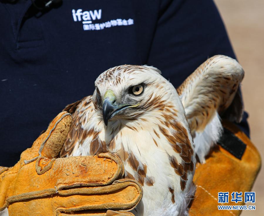 3月20日,北京猛禽救助中心猛禽康復(fù)師周蕾準(zhǔn)備放飛大鵟。新華社記者 李京 攝