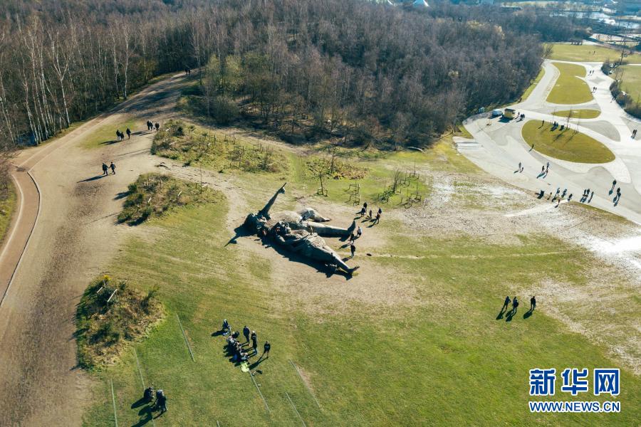 這是3月20日在比利時(shí)博姆市的德舒爾森林公園拍攝的“巨人”雕塑(無人機(jī)照片)。新華社記者 張鋮 攝