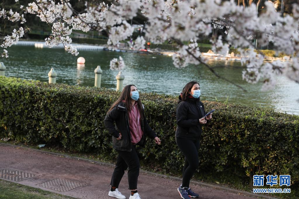 3月24日,佩戴口罩出行的市民從意大利首都羅馬盛開(kāi)的櫻花樹下走過(guò)。