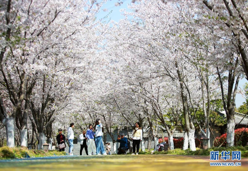 3月26日,游客在江蘇省揚州市邗江區(qū)甘泉街道的櫻花園賞花拍照。