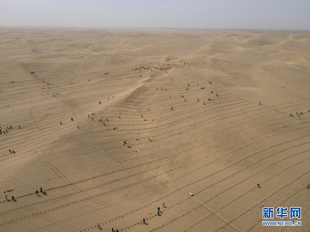 3月28日,人們在且末縣城不遠(yuǎn)處的塔克拉瑪干沙漠內(nèi)植樹(無人機照片)。