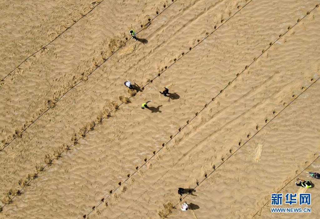 3月28日,人們?cè)谇夷┛h城不遠(yuǎn)處的塔克拉瑪干沙漠內(nèi)植樹(無(wú)人機(jī)照片)。