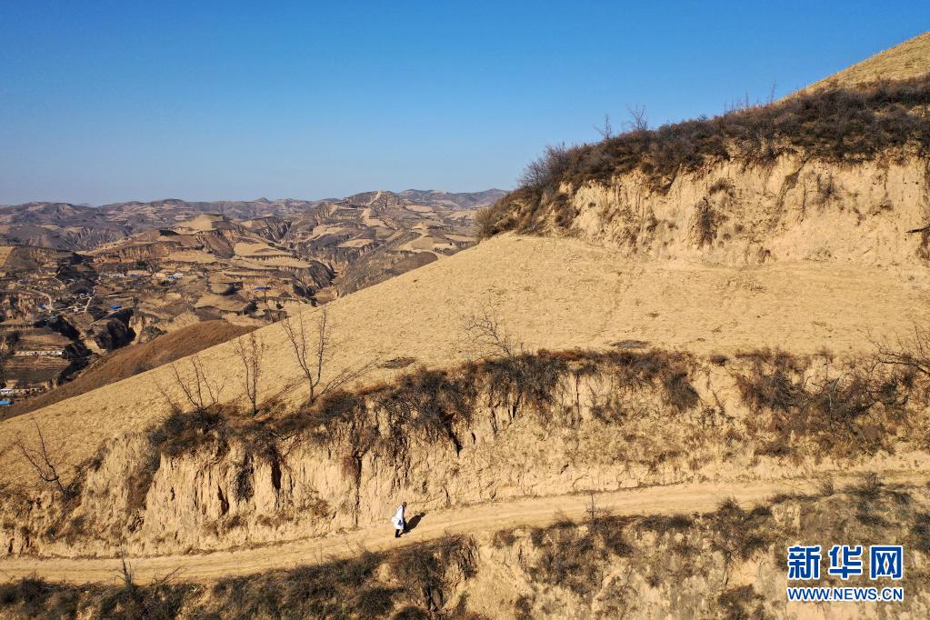 山西省石樓縣鐵頭村的村醫(yī)張尚保走在出診的山路上(3月23日攝,無人機照片)。新華社記者 詹彥 攝