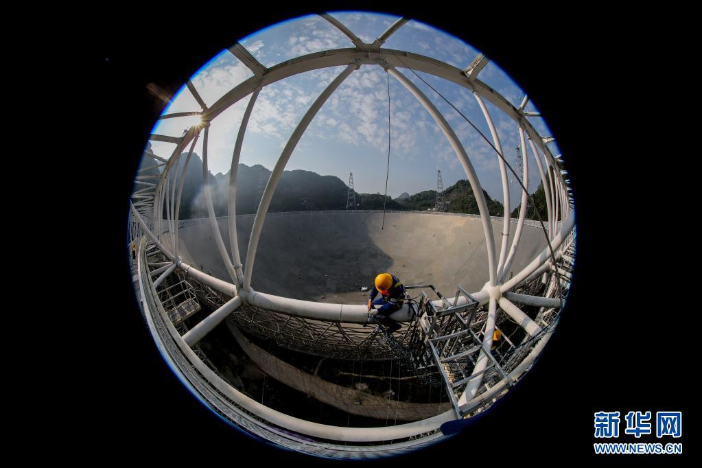 3月29日,工作人員對FAST圈梁進行維護(維護保養(yǎng)期間魚眼鏡頭拍攝)。