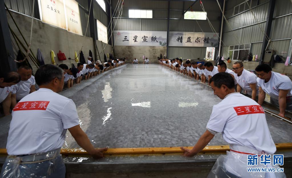 近日,在宣紙產(chǎn)地安徽省宣城市涇縣,“四丈宣紙”的抄制在一家紙業(yè)有限公司啟動。50余名撈紙師傅操作巨型紙簾,齊心協(xié)力,在紙槽旁進(jìn)行撈紙作業(yè)。來回起落兩次,動作整齊劃一。隨后工人們將紙簾吊起放至一邊揭下,一張巨大的宣紙便撈制成功。經(jīng)過曬、剪等工序后, 制成長13.2米、寬3.6米的巨型宣紙就是“四丈宣紙”。