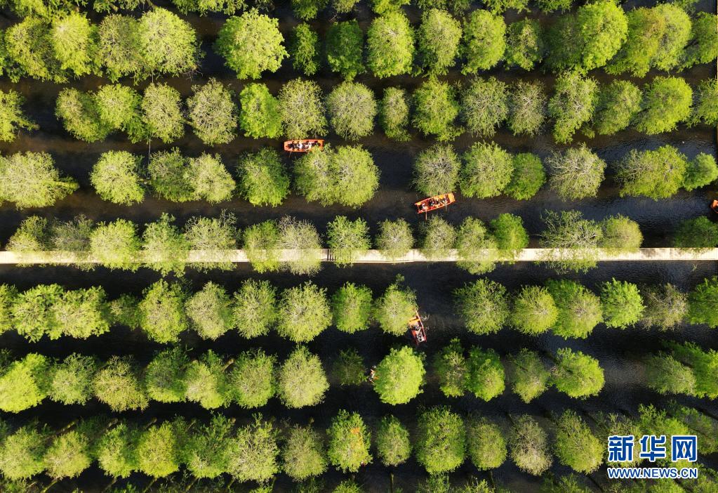5月3日,在江蘇省揚(yáng)州市淥洋湖濕地公園,游客在水上森林劃船游玩(無(wú)人機(jī)照片)。新華社發(fā)(孟德龍 攝)