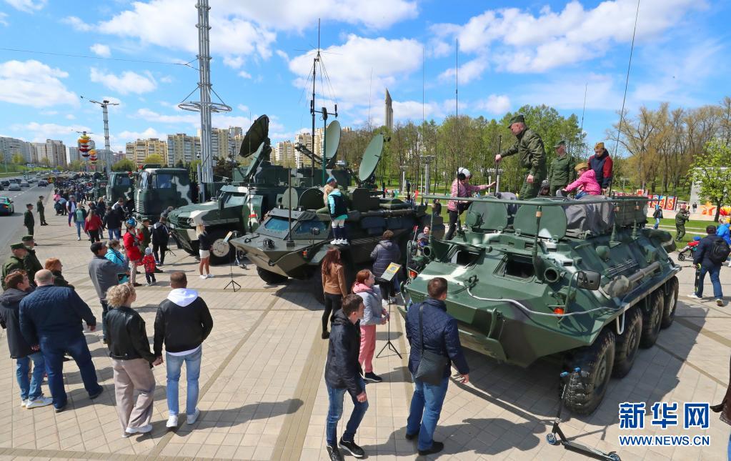5月9日,參加勝利日節(jié)慶活動的人們在白俄羅斯首都明斯克參觀軍用車輛。