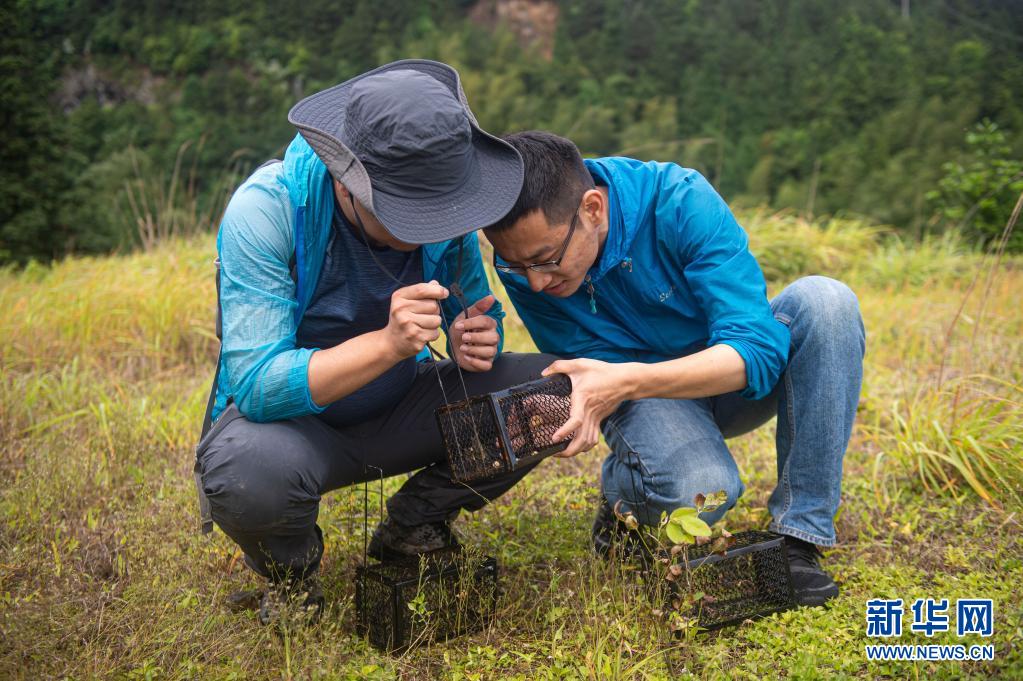 5月12日,南京環(huán)境科學研究所研究員雍凡(左)與參與此次調(diào)查的助理劉煜坤觀察誘捕籠內(nèi)的動物活動痕跡。