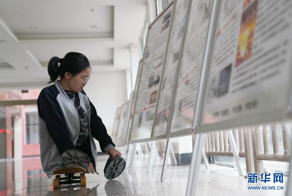 2021年5月11日,蔣張子怡在學(xué)校的走廊內(nèi)閱覽海報(bào)。