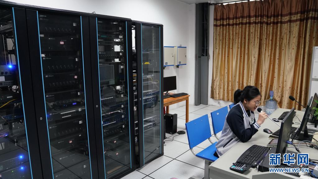 2021年5月11日,蔣張子怡在學(xué)校的廣播站進(jìn)行播音。
