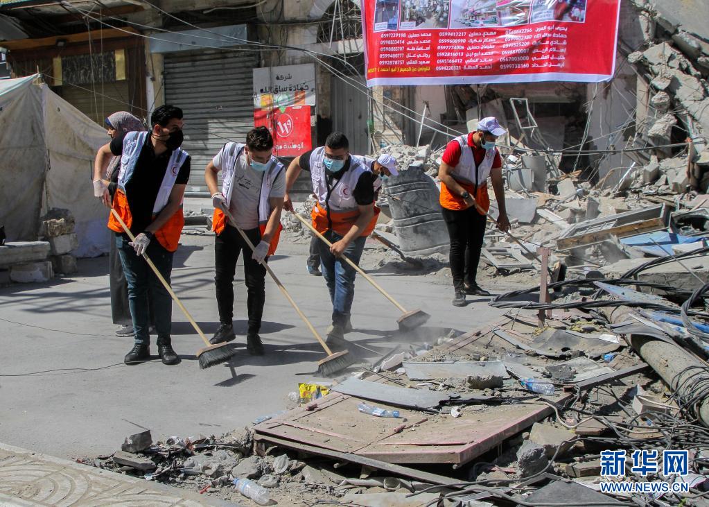 5月23日,巴勒斯坦志愿者在加沙城一處遭到以色列轟炸的地點清理廢墟。