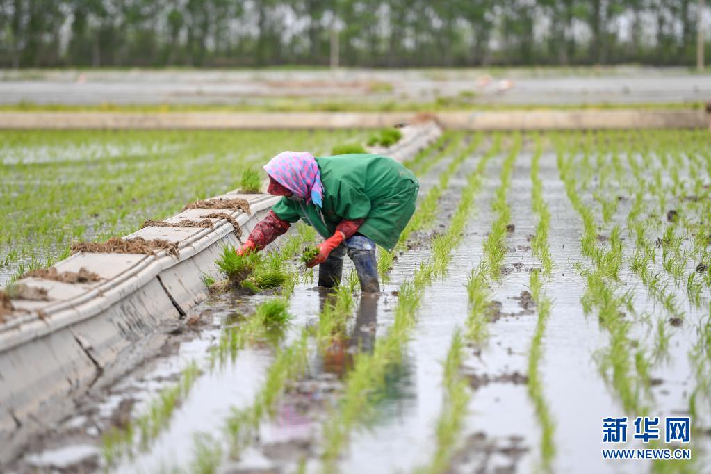 5月26日,在吉林省吉林市永吉縣萬(wàn)昌鎮(zhèn)宇豐米業(yè)2萬(wàn)畝高標(biāo)準(zhǔn)水田基地,農(nóng)民進(jìn)行水稻補(bǔ)苗工作。