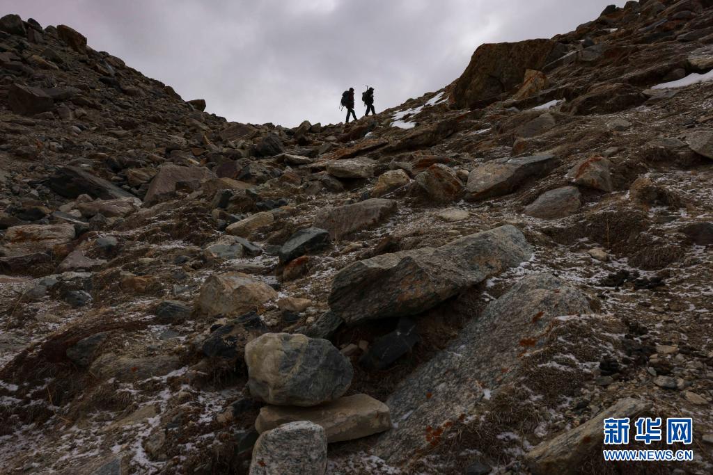 在慕士塔格峰大本營附近,別克米爾扎·圖爾達(dá)力(右)和同伴庫爾班巴依·努爾麥麥提翻越一處陡坡(5月16日攝)。新華社記者 胡虎虎 攝