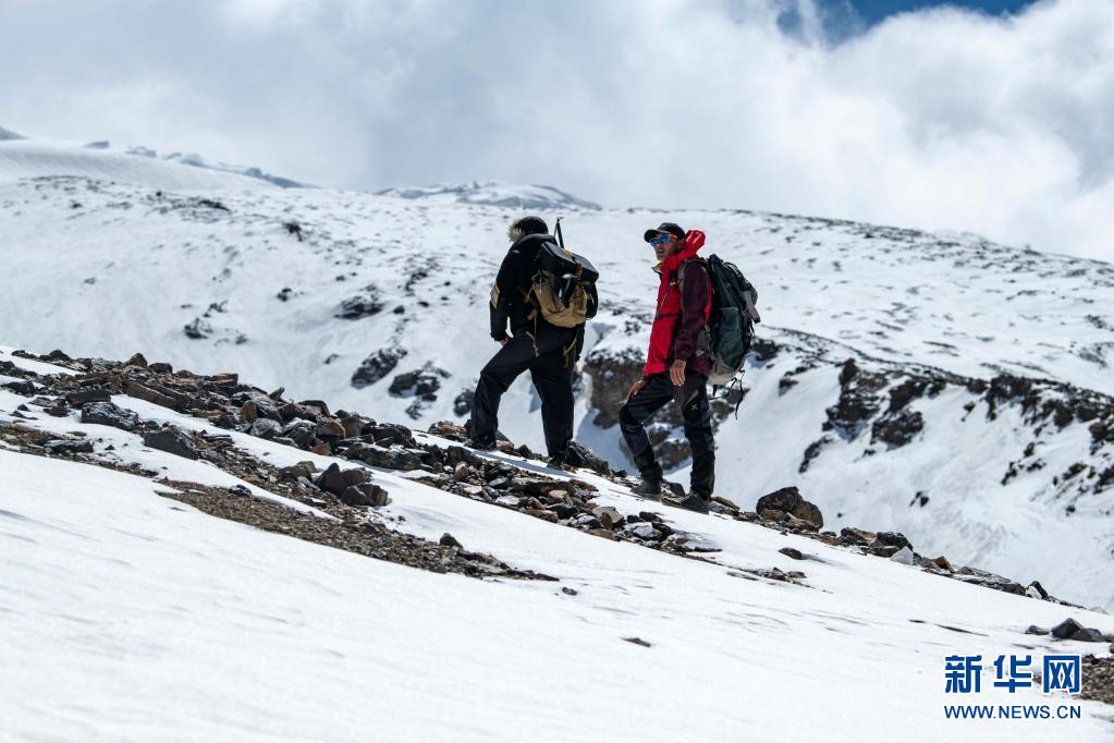 在當天的適應(yīng)性訓(xùn)練中,別克米爾扎·圖爾達力(左)和同伴庫爾班巴依·努爾麥麥提行進在慕士塔格峰海拔約5000米的山路上(5月15日攝)。新華社記者 胡虎虎 攝