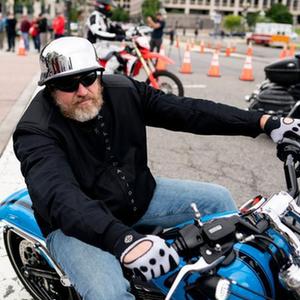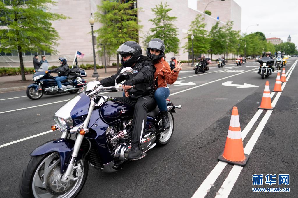 5月30日,在美國(guó)首都華盛頓,參加“滾雷”摩托車大游行的車輛駛過街頭。