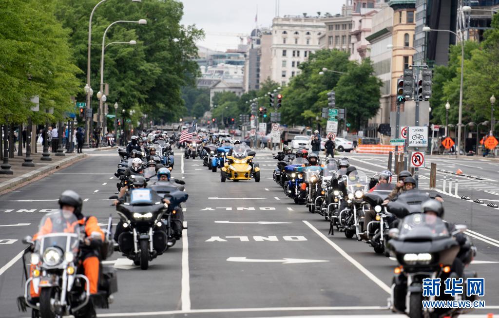 5月30日,在美國(guó)首都華盛頓,參加“滾雷”摩托車(chē)大游行的車(chē)輛駛過(guò)街頭。