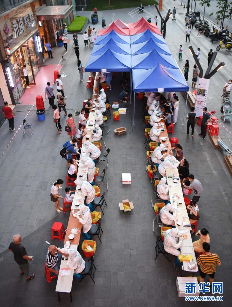5月27日,在廣州荔灣區(qū)廣鋼新城核酸臨時(shí)采集點(diǎn),南方醫(yī)科大學(xué)南方醫(yī)院的醫(yī)務(wù)人員進(jìn)行核酸檢測(cè)采樣。新華社記者 鄧華 攝