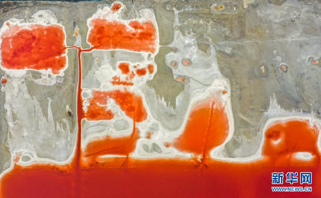 近日,隨著氣溫不斷升高,山西運(yùn)城鹽湖呈現(xiàn)五彩斑斕的景象。