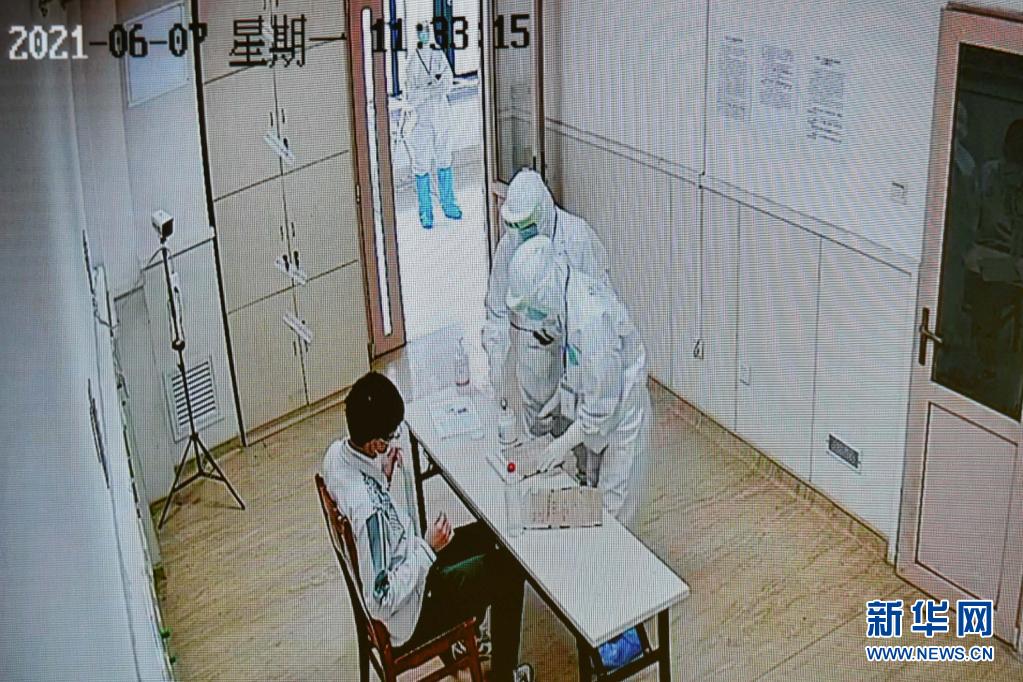 6月7日,廣東省國家教育考試指揮中心的監(jiān)控畫面顯示,上午語文考試結(jié)束后,廣州市八醫(yī)院嘉禾院區(qū)醫(yī)護(hù)人員對(duì)隔離病房考生的試卷、答題卡、稿紙等用品進(jìn)行消毒。新華社記者 劉大偉 攝