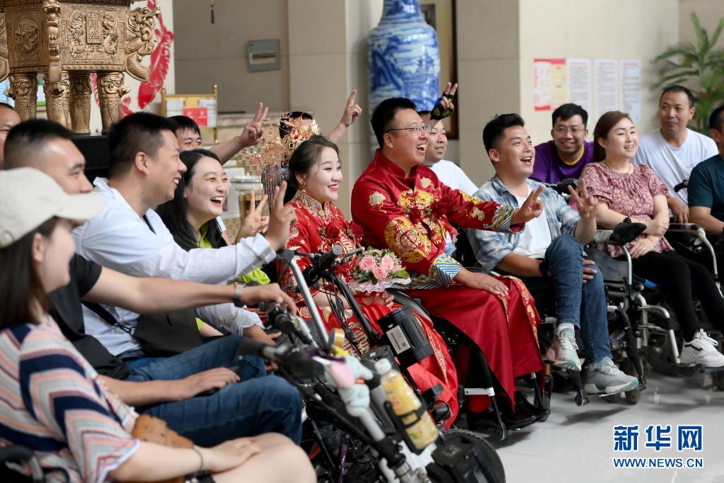 新郎周海云、新娘關美和親友們在婚禮上合影(6月15日攝)。新華社發(fā)(劉亮亮攝)