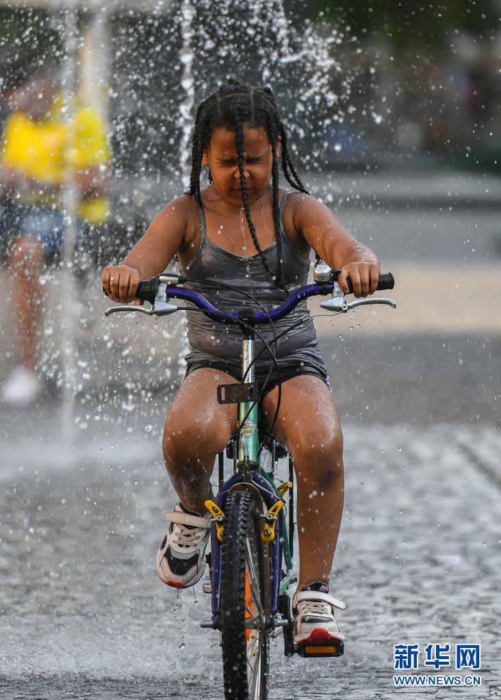 6月17日,在德國(guó)法蘭克福,一名小朋友騎車穿過(guò)噴泉納涼。