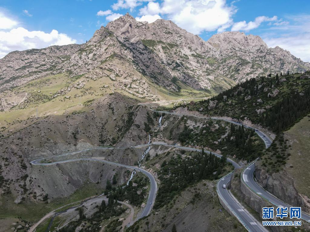 車輛行駛在新疆獨庫公路的一處盤山路段(6月20日攝,無人機照片)。