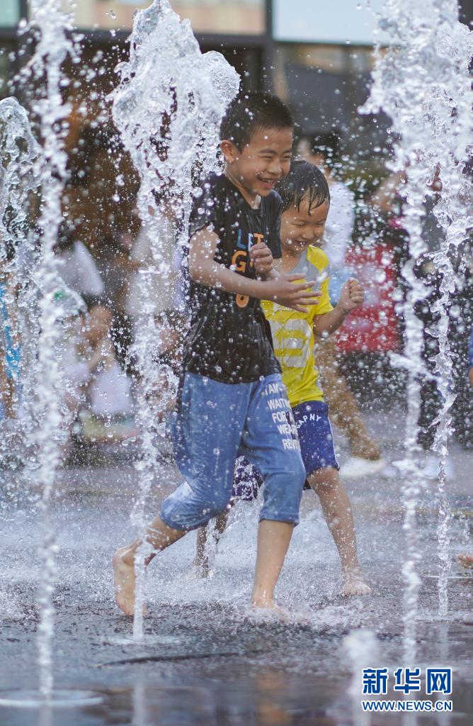 6月20日,孩子們?cè)诒本┤A熙LIVE·五棵松商業(yè)街區(qū)一處噴泉戲水。