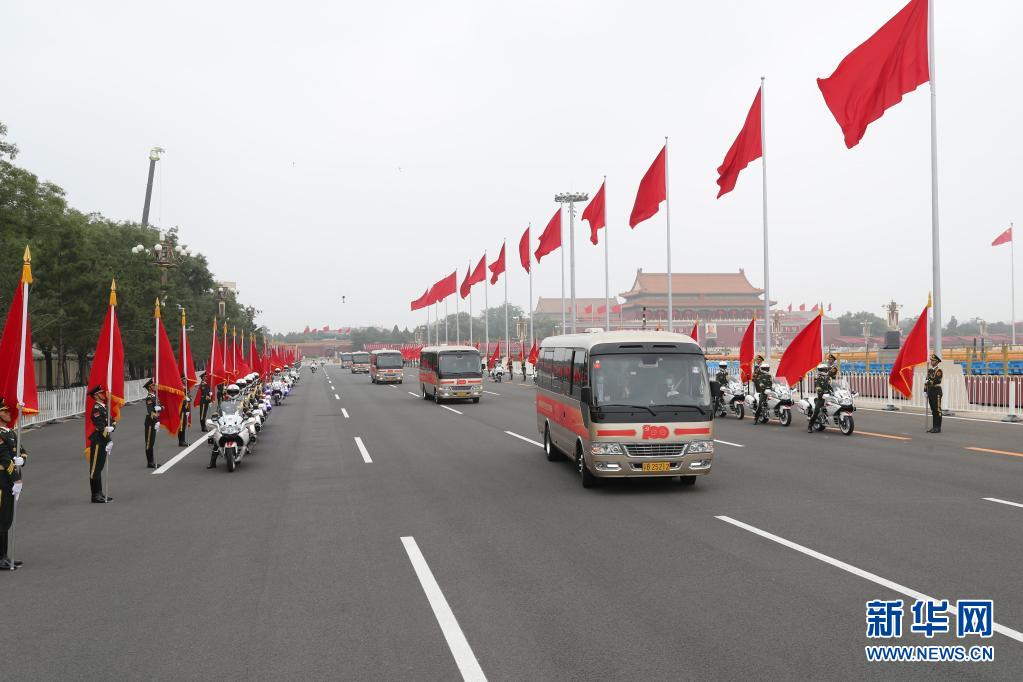 6月29日,慶祝中國共產(chǎn)黨成立100周年“七一勛章”頒授儀式在北京人民大會(huì)堂金色大廳隆重舉行。這是“七一勛章”獲得者集體乘坐禮賓車,由國賓護(hù)衛(wèi)隊(duì)護(hù)衛(wèi)前往人民大會(huì)堂。新華社記者 丁海濤 攝