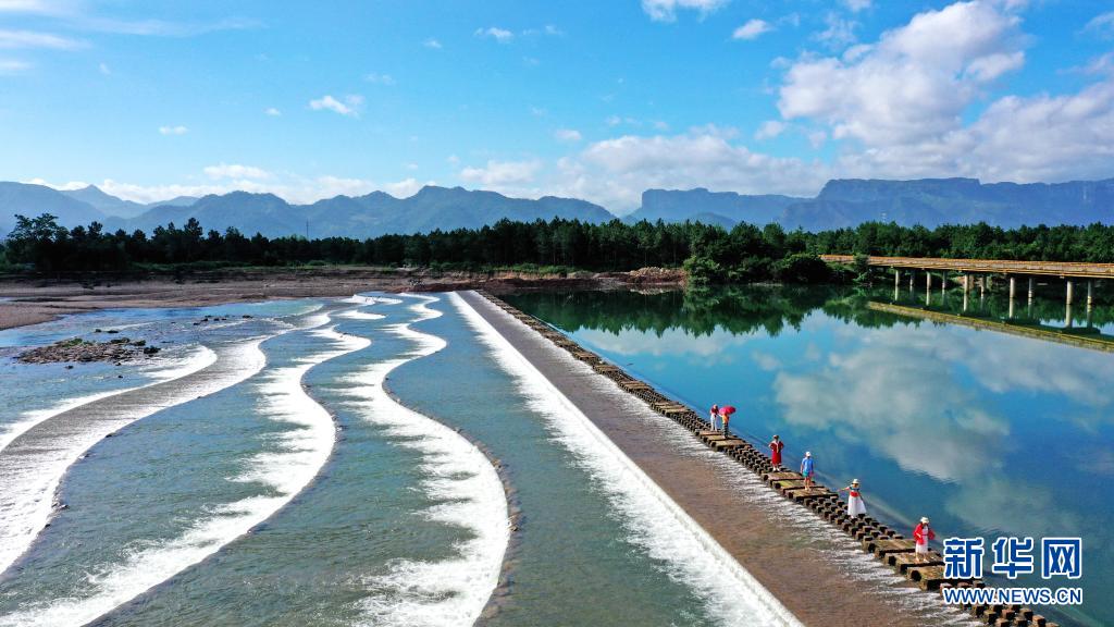 7月6日,市民在浙江省臺州市仙居縣永安溪白塔鎮(zhèn)段游玩(無人機(jī)照片)。