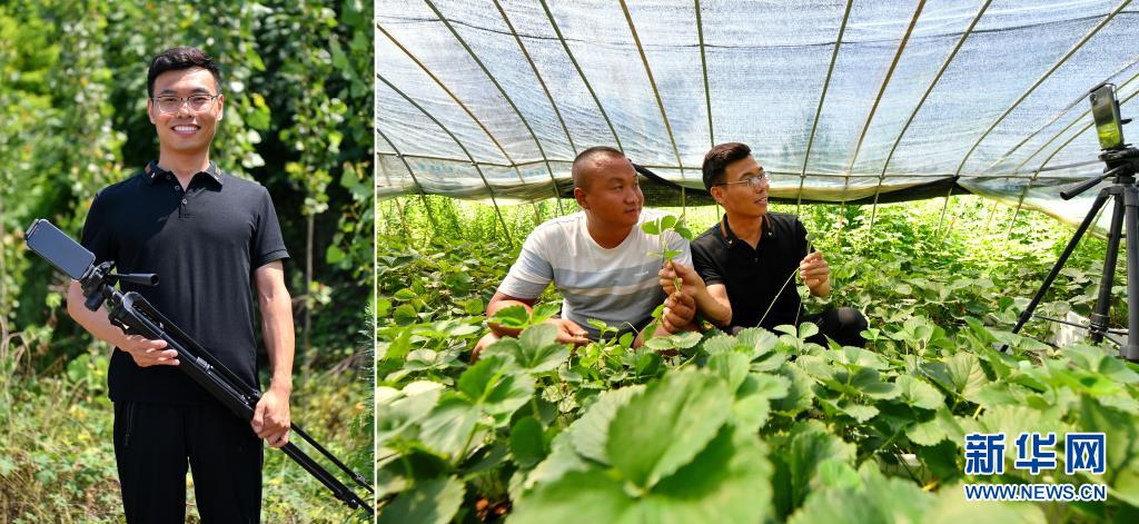 拼版照片:左圖為張成蘊(yùn)在山西省運(yùn)城市絳縣臨澮村的田間;右圖為張成蘊(yùn)(右)在大棚里錄制農(nóng)業(yè)科普視頻(7月14日攝)。今年34歲的張成蘊(yùn)大學(xué)畢業(yè)后,一直熱衷于用拍攝視頻的方式宣傳家鄉(xiāng)的風(fēng)土人情。2018年8月,他開始在社交平臺(tái)上幫助鄉(xiāng)親們直播帶貨,真誠的笑容、優(yōu)質(zhì)的產(chǎn)品和專業(yè)的知識是他吸引粉絲的“訣竅”。
