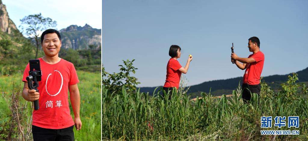 拼版照片:左圖為劉瑞旭拿著手機(jī)穩(wěn)定器;右圖為在山西省黎城縣巖井村,劉瑞旭(右)和合作社同事在谷子地里直播(7月8日攝)。今年29歲的劉瑞旭開過飯店、賣過房子、種過果樹,2019年回到老家平順縣榔樹園村做起了職業(yè)農(nóng)民,成為太行山上的“新農(nóng)人”?;卮搴?,劉瑞旭和合作社的同事抓住網(wǎng)絡(luò)直播帶貨的熱潮,嘗試田間地頭直播。借助網(wǎng)絡(luò)的力量,合作社的小米搭上了“互聯(lián)網(wǎng)+”快車銷往全國各地。