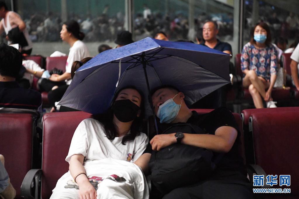 7月20日,旅客滯留在鄭州東站。候車廳出現(xiàn)漏雨情況,旅客撐傘擋雨。