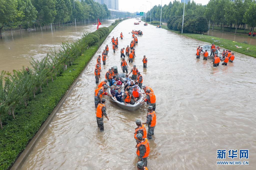 7月22日,在阜外華中心血管病醫(yī)院附近的錦繡路與鄭開大道交叉口,救援人員利用舟艇轉(zhuǎn)移人員(無人機照片)。