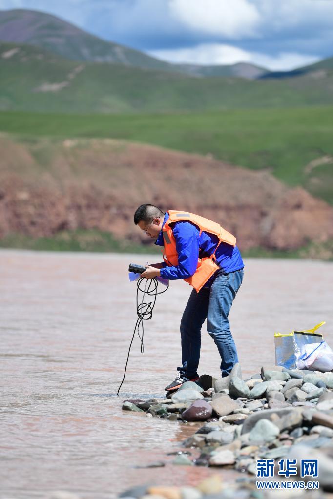 2021年長江源綜合科考的科考隊員趙良元在通天河流域觀測水文(7月24日攝)。