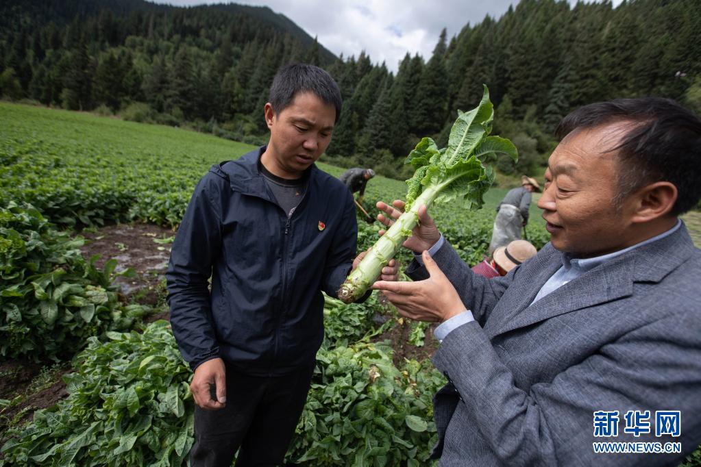 8月13日,在四川省阿壩藏族羌族自治州紅原縣刷經(jīng)寺鎮(zhèn)加當(dāng)村,農(nóng)業(yè)技術(shù)推廣研究員茍?。ㄇ坝遥┰诓榭词斋@的萵筍生長情況。