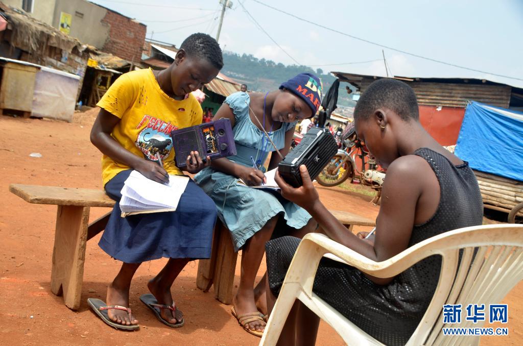 8月16日,學(xué)生在烏干達(dá)首都坎帕拉用收音機(jī)收聽無線電廣播的教學(xué)內(nèi)容。