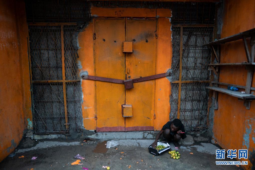 8月17日,一名男子在海地萊凱一個緊閉的門前挑揀水果。