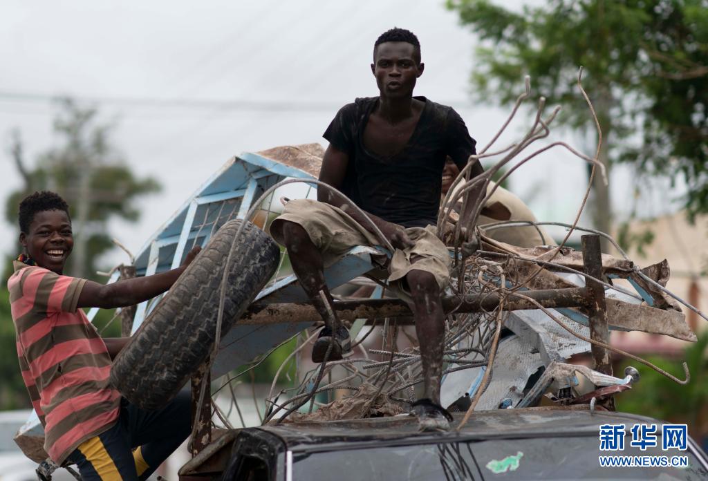 8月17日,兩名男子在海地萊凱搭乘汽車運(yùn)送物品。