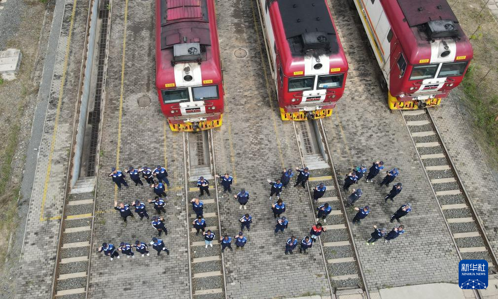 8月19日,在肯尼亚内罗毕非洲之星铁路运营有限责任公司机务运转整备场,中肯两国铁路工作者在机车前站列并组成“3000”字样,以纪念蒙内铁路实现安全运营3000天(无人机照片)。