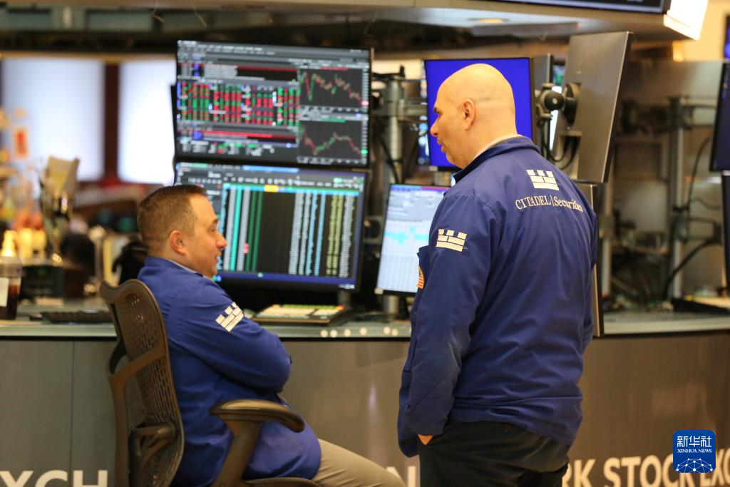 4月27日,交易员在美国纽约证券交易所交易大厅内交谈。