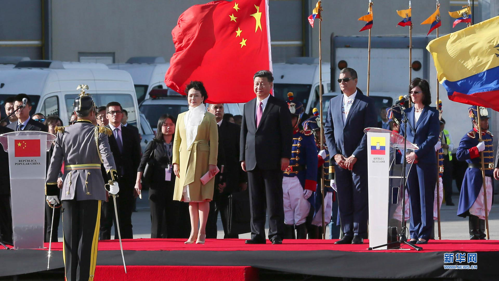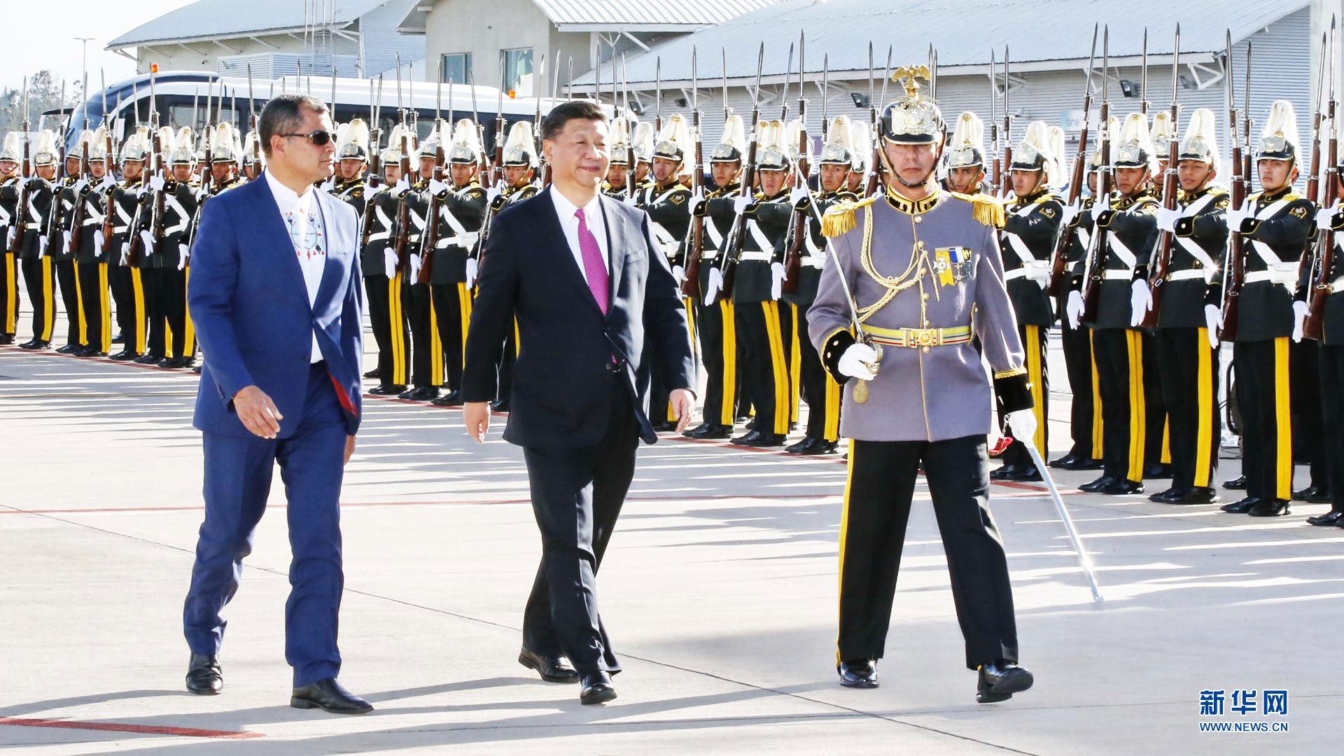 當地時間11月17日,國家主席習近平乘專機抵達基多,開始對厄瓜多爾共和國進行國事訪問。這是厄瓜多爾總統(tǒng)科雷亞在機場為習近平舉行隆重歡迎儀式。新華社記者 蘭紅光 攝2016-11-18