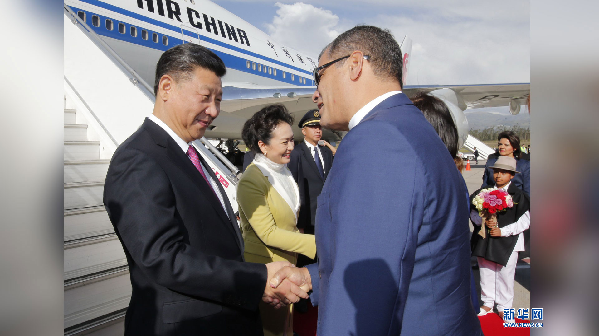 當地時間11月17日,國家主席習近平乘專機抵達基多,開始對厄瓜多爾共和國進行國事訪問。厄瓜多爾總統(tǒng)科雷亞和夫人馬勒布等在舷梯旁熱情迎接習近平和夫人彭麗媛。新華社記者 鞠鵬 攝2016-11-18