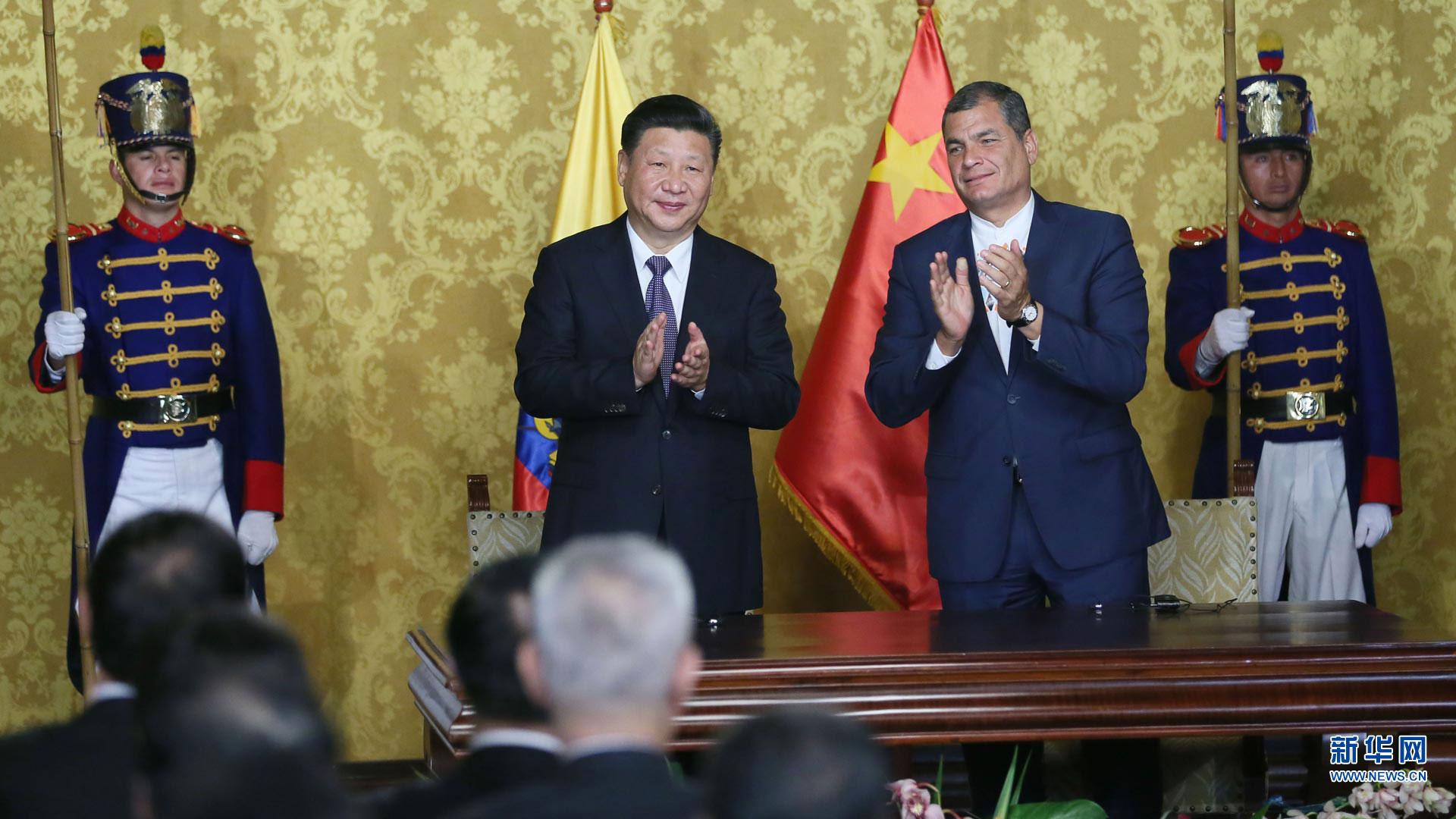 當地時間11月17日,國家主席習近平在基多同厄瓜多爾總統(tǒng)科雷亞舉行會談。這是會談后,兩國元首見證雙邊合作文件的簽署。 新華社記者 鞠鵬攝2016-11-18